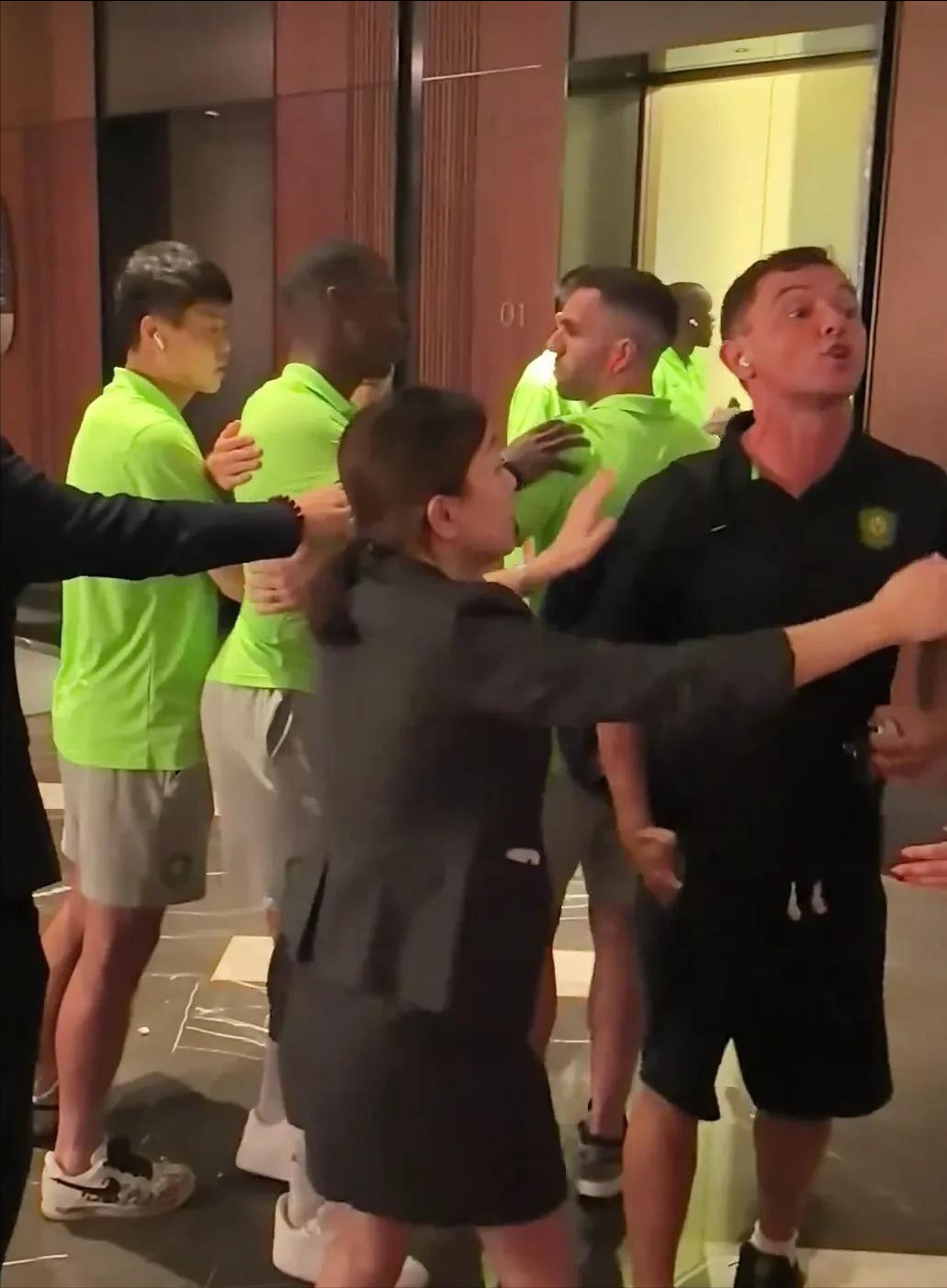 张玉宁、王刚冲出来的样子非常凶猛,作为1米85的大中锋和1米88的铁血后卫,如果他们真要动手,恐怕球迷可真经不起。这个时候可以看到我们酒店的女性的工作人员,也就是这位染着一些黄发的大堂经理小姐姐,一直拦在球员和球迷之间,先后隔开了张玉宁和王刚。